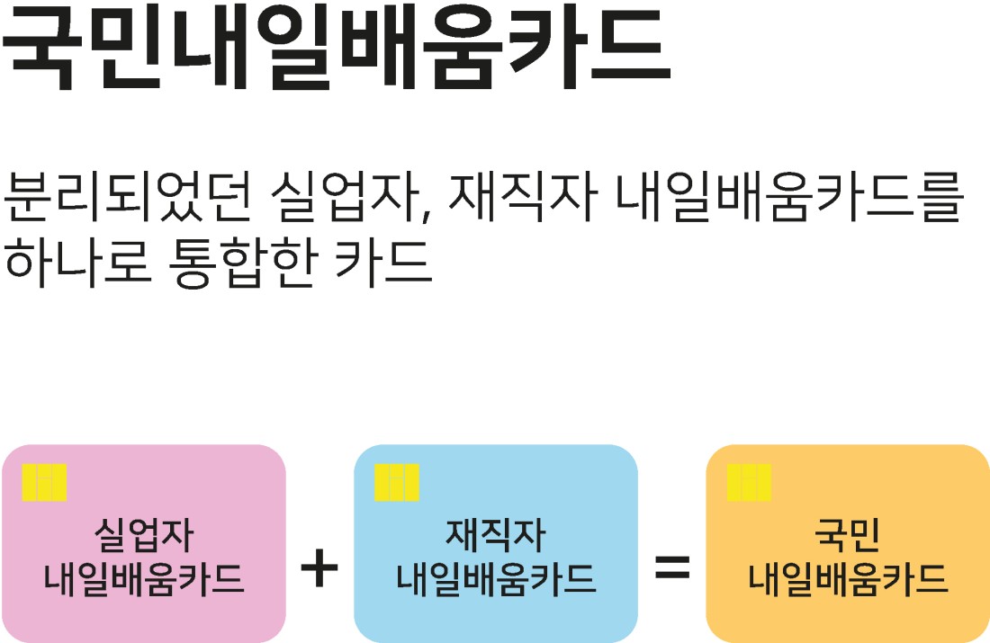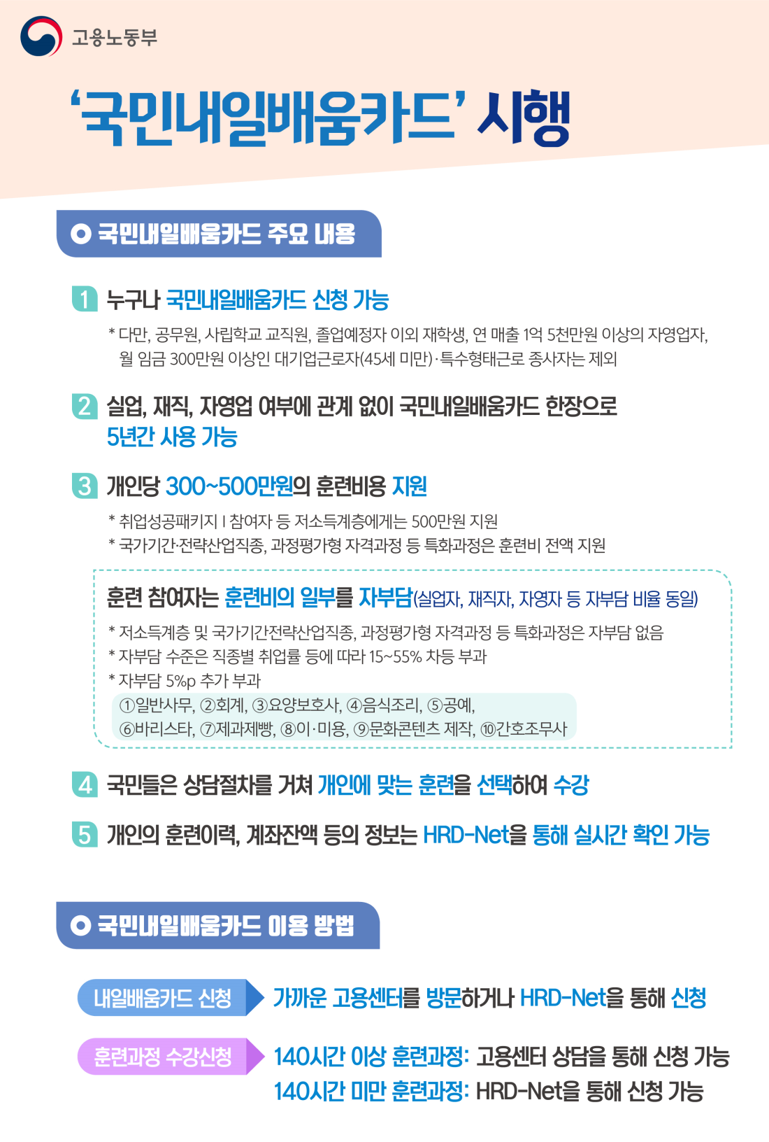실업, 재직, 자영업 여부에 관계없이 국민내일배움카드를 발급하고 일정 금액의 훈련비를 지원함으로써 직업능력개발 훈련에 참여할 수 있도록 하며,직업능력개발훈련 이력을 종합적으로 관리하는 제도입니다.